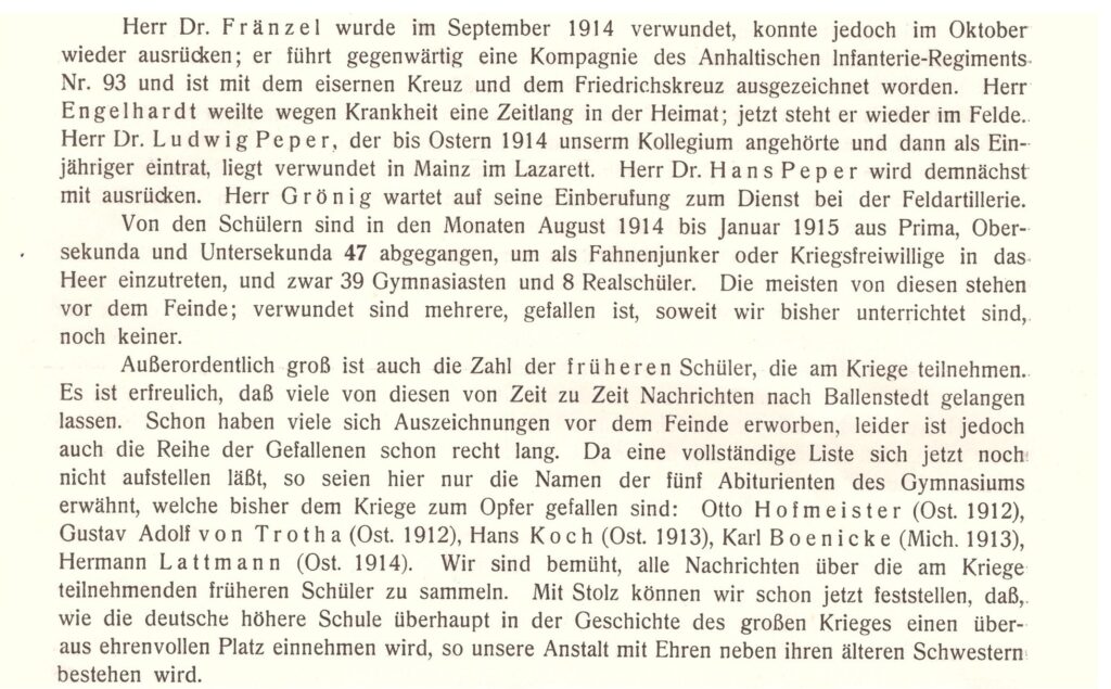 Ab der Seite 19 kann die Geschichte der Anstalt nachgelesen werden, wobei auch hier der Fokus auf die Zeit um 1915 liegt, so dass dem Leser ein Eindruck vom schulischen Leben im 1. Weltkriegt vermittelt wird. Trotz der frühen Phase des Krieges sind hier Stolz und die Trauer ständige Begleiter des schulischen Lebens.