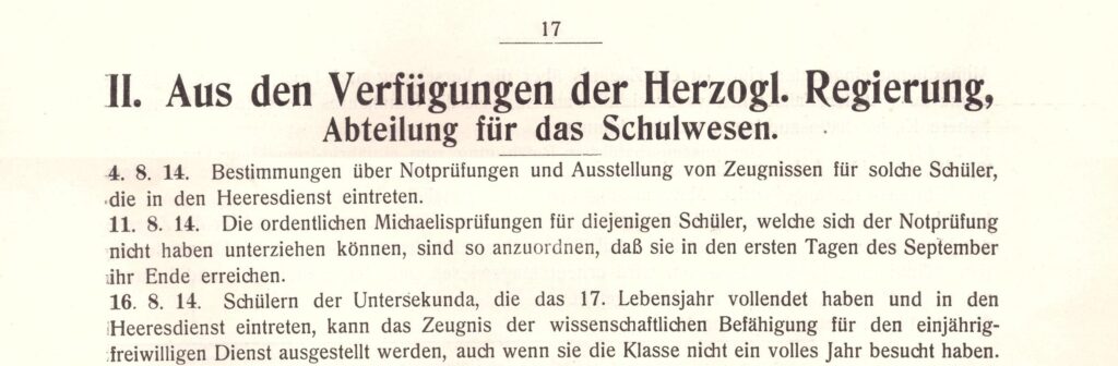 Das Schuljahr 1915 ist geprägt durch die Frühphase des 1. Weltkrieges, was an verschiedenen Stellen deutlich wird. Ab Seite 17 kann die Verfügung der Herzoglichen Regierung (eine Art „Jahresplan“) eingesehen werden, die deutlich vom Kriegsgeschehen dominiert wird.