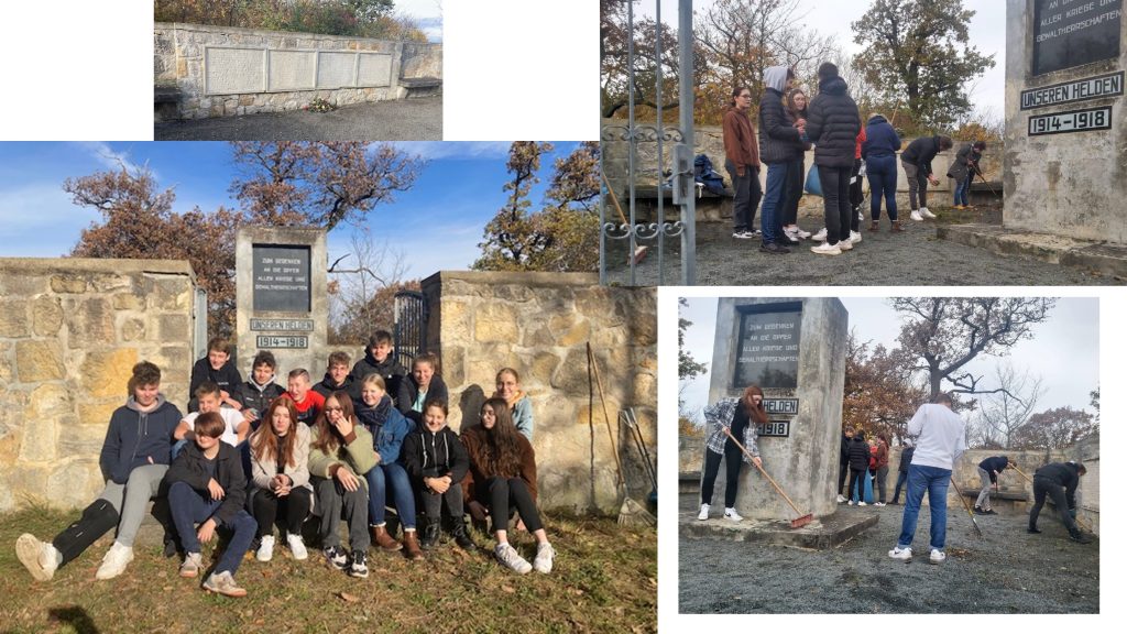 Im 20. Jahrhundert wurden viele Denkmäler zum Gedenken an die Opfer errichtet. Wie auch das Kriegerdenkmal in Ballenstedt auf dem Brauberg. Wir, die Klasse 9b des Wolterstorff-Gymnasiums, behandeln momentan in Geschichte den 1. Weltkrieg. Aufgrund dessen haben wir und unsere Geschichtslehrerin Frau Krauß diese Gedenkstätte besucht, um sie zu pflegen. Wir haben herumliegenden Müll entfernt, den Bereich von Unkraut befreit und mit Besen als auch Harken wieder Ordnung geschaffen.